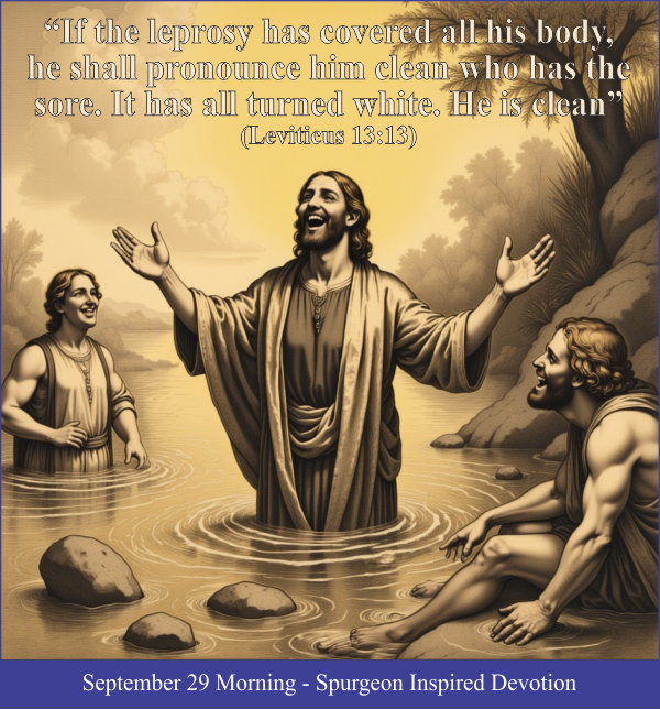 But there’s a spiritual lesson in this. Because  we’re all sinners, we’re all spiritual lepers, and the law of the leper applies  to us. When a man sees himself to be altogether lost and ruined, covered entirely  with the defilement of sin, and no part free from pollution; when he recognizes  he has no righteousness of his own, and pleads guilty before the Lord, then he can  be declared clean by the blood of Christ.